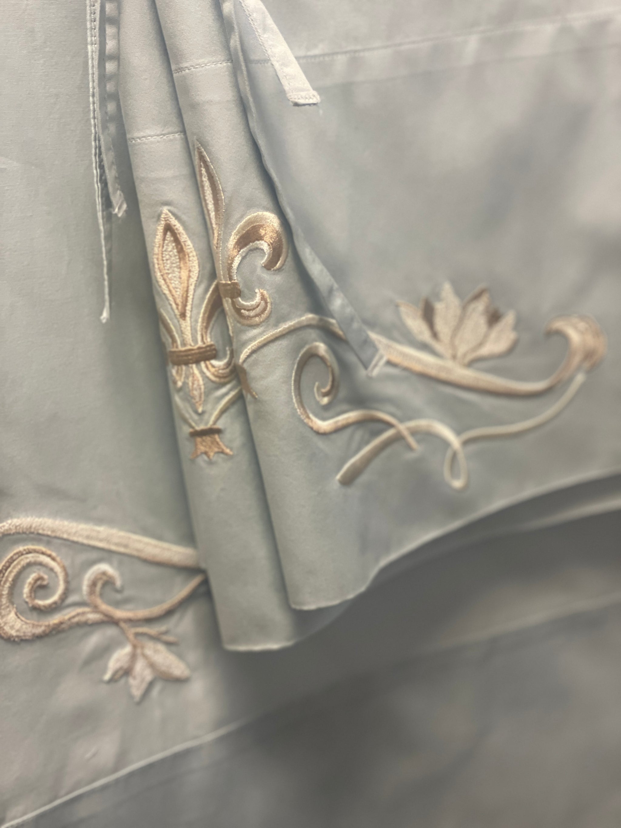 At Kearsley, we offer a curated selection of fine linens in a variety of fabrics, colors, and time-honored embroidery and appliqué designs. For those seeking a personalized touch, we also provide custom embroidery options to incorporate unique motifs or details into our linens and jacquards.