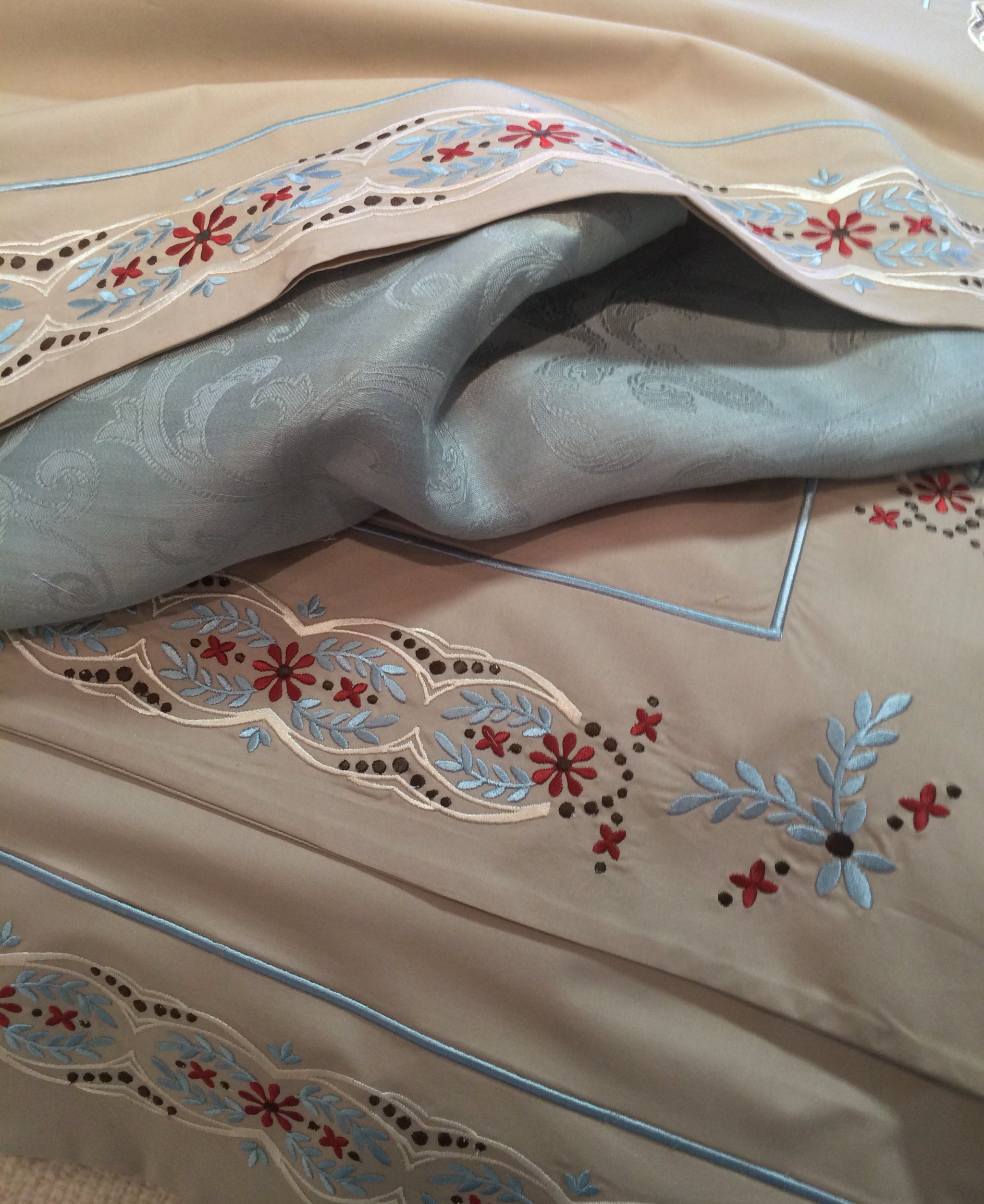 Our artisans use the finest threads—including long-staple cotton, silk, polyester, and rayon—to ensure durability and beauty. Bed linens are embroidered using 12-13" hoops, ensuring patterns align seamlessly. For corners and intricate details, our expert operators employ hand-guided techniques for an impeccable finish.