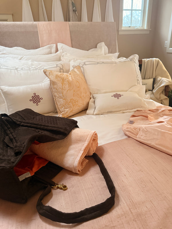 The Kearsley Atelier is open to the public. Guests are welcome to stop in to explore bedding, bath linens, tabletop, barware, gifts, cashmere, and objects for the home. Some visitors come to design a full bed, others simply stop by on the way to dinner or a gathering to find something thoughtful to bring.